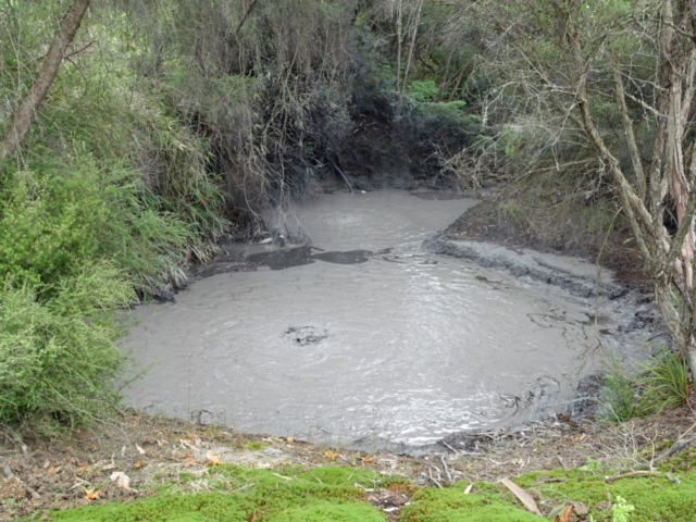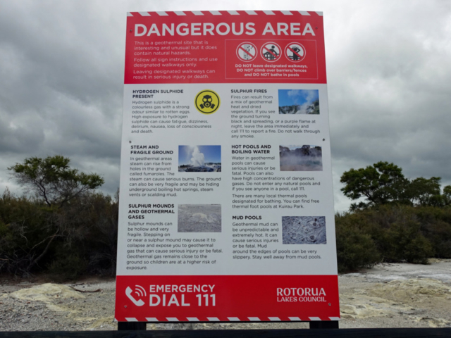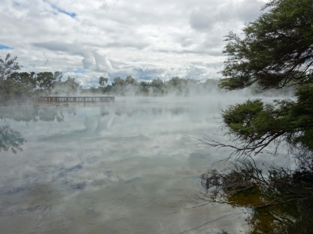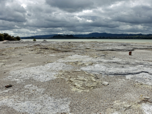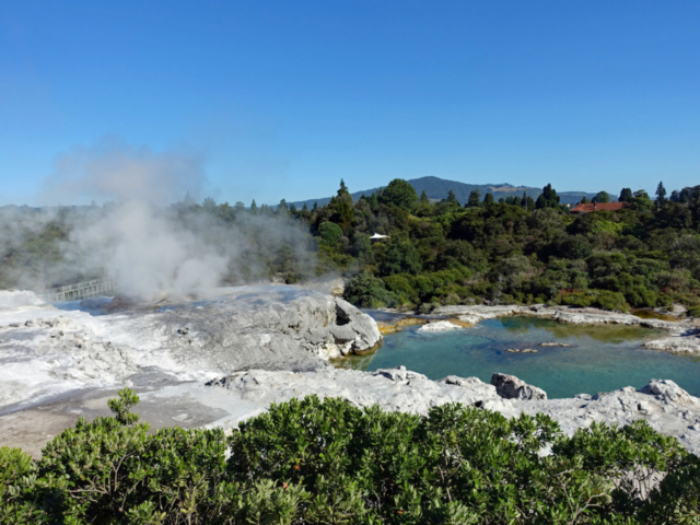 Right behind the Rotorua Museum, which is closed until 2028 for repairs and renovations, is the Sulphur Point walkway. This is a free walk along the lake where the hydrogen-sulphide smell (rotten eggs) is very evident. The walkway offers several great spots to safely view active geothermal features up close, with steam rising from the ground and gurgling waters. Blair and I both commented that we were able to walk closer to the lake last time we were here but it did feel a bit dangerous even then, so we were not surprised that fencing has been put up to keep folks back. Back then there were signs warning that the ground could collapse under you and not get too close to the open holes…I assume it became too risky.