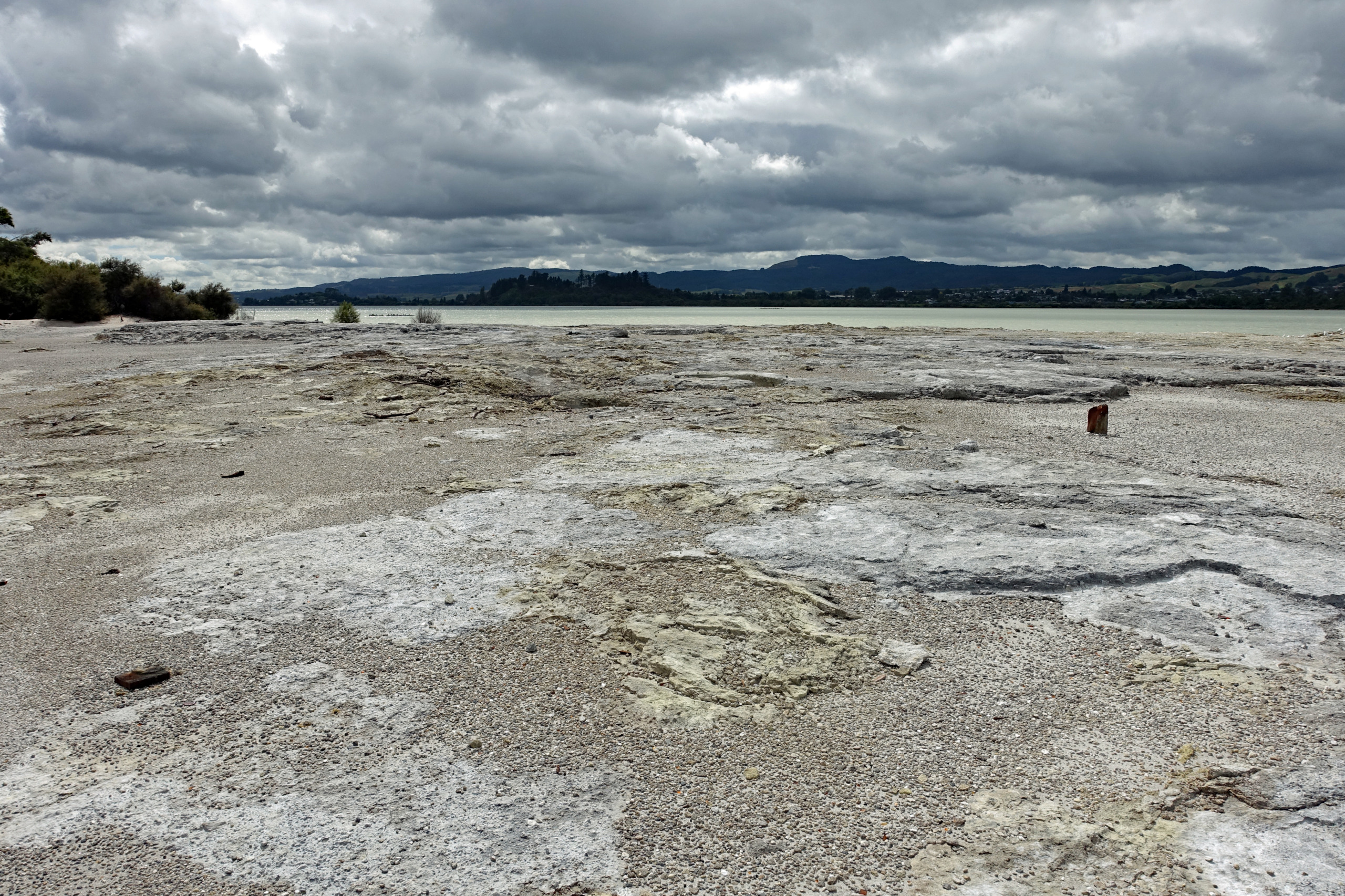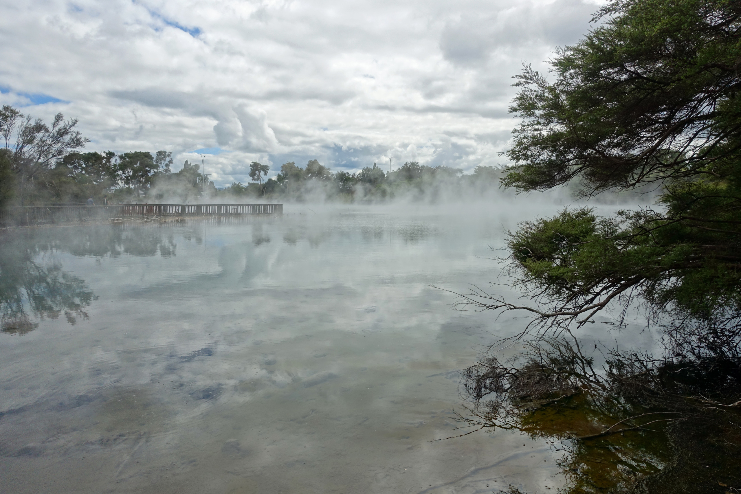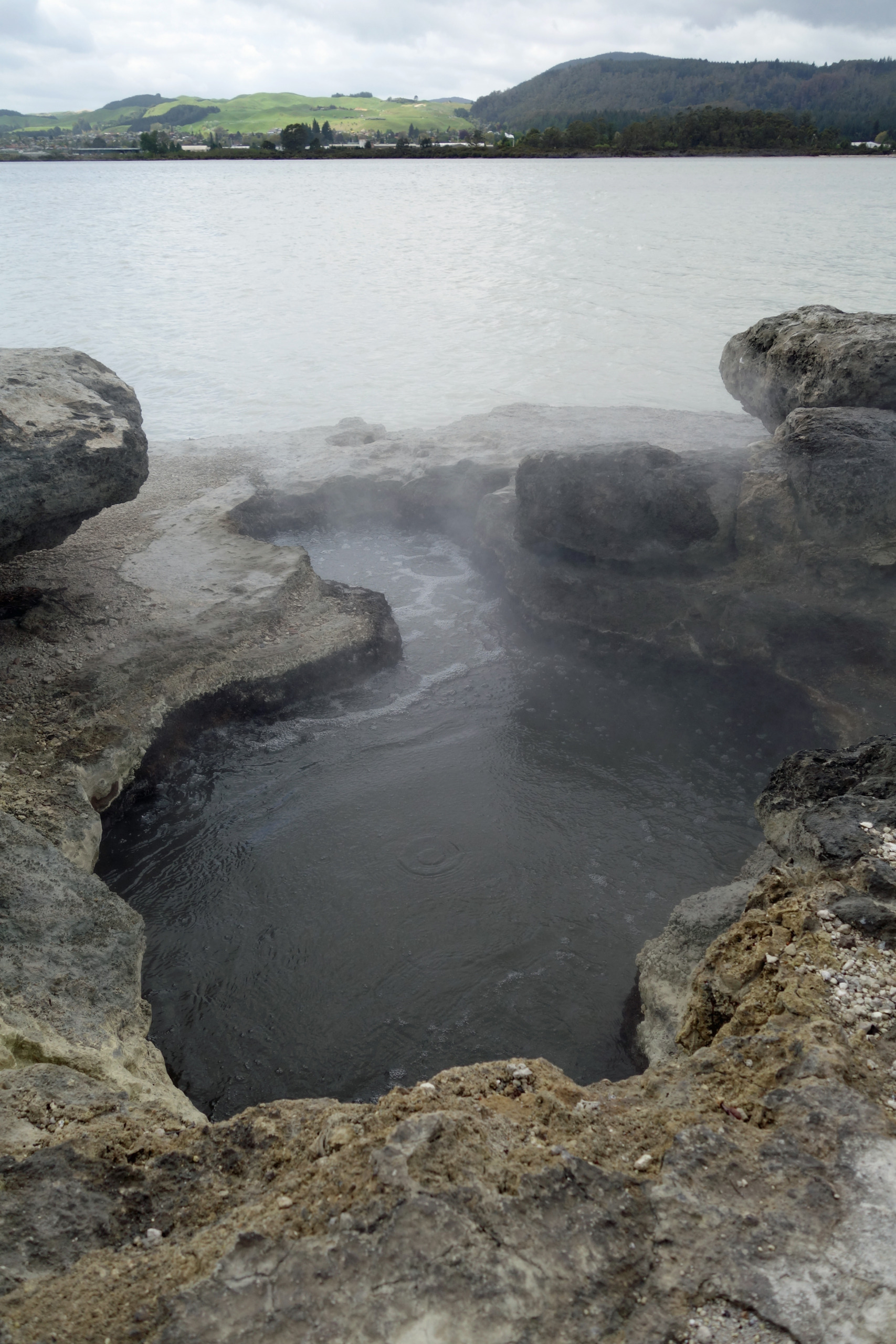 Right behind the Rotorua Museum, which is closed until 2028 for repairs and renovations, is the Sulphur Point walkway. This is a free walk along the lake where the hydrogen-sulphide smell (rotten eggs) is very evident. The walkway offers several great spots to safely view active geothermal features up close, with steam rising from the ground and gurgling waters. Blair and I both commented that we were able to walk closer to the lake last time we were here but it did feel a bit dangerous even then, so we were not surprised that fencing has been put up to keep folks back. Back then there were signs warning that the ground could collapse under you and not get too close to the open holes…I assume it became too risky.