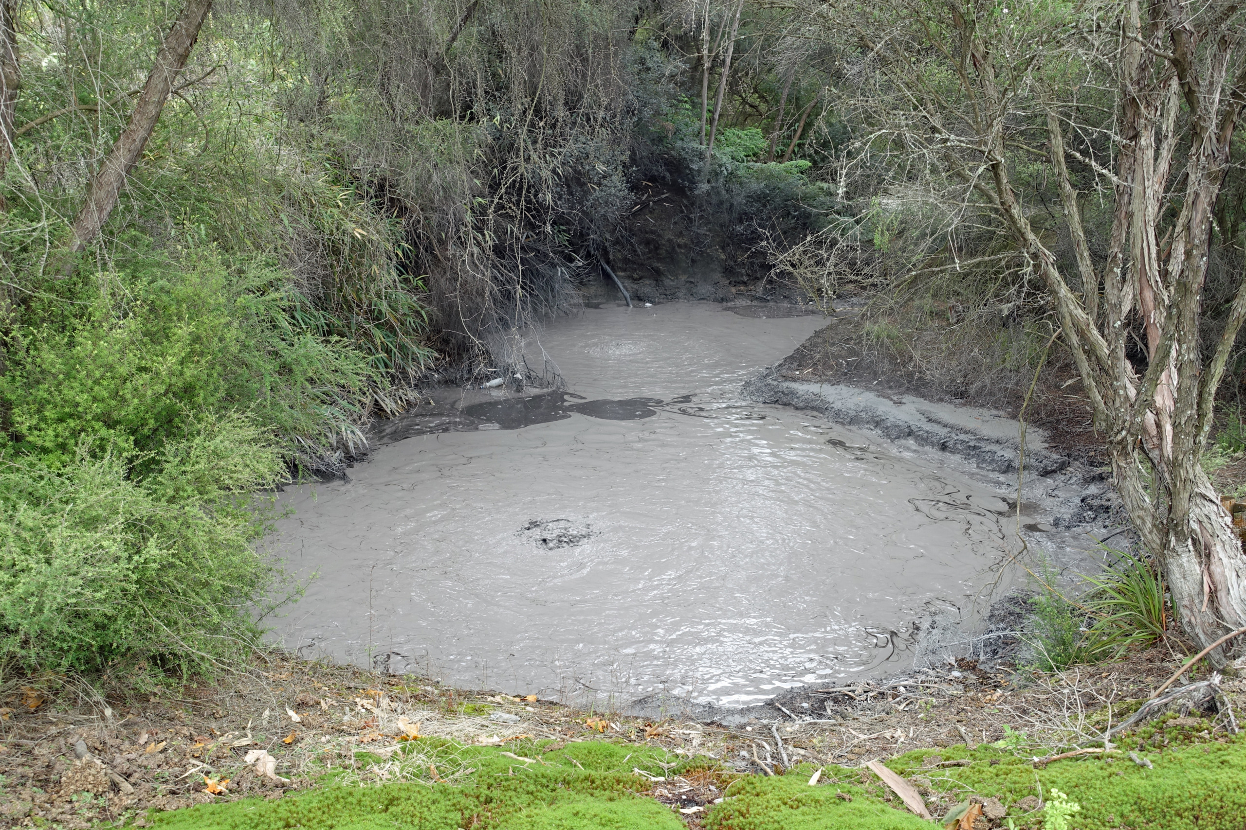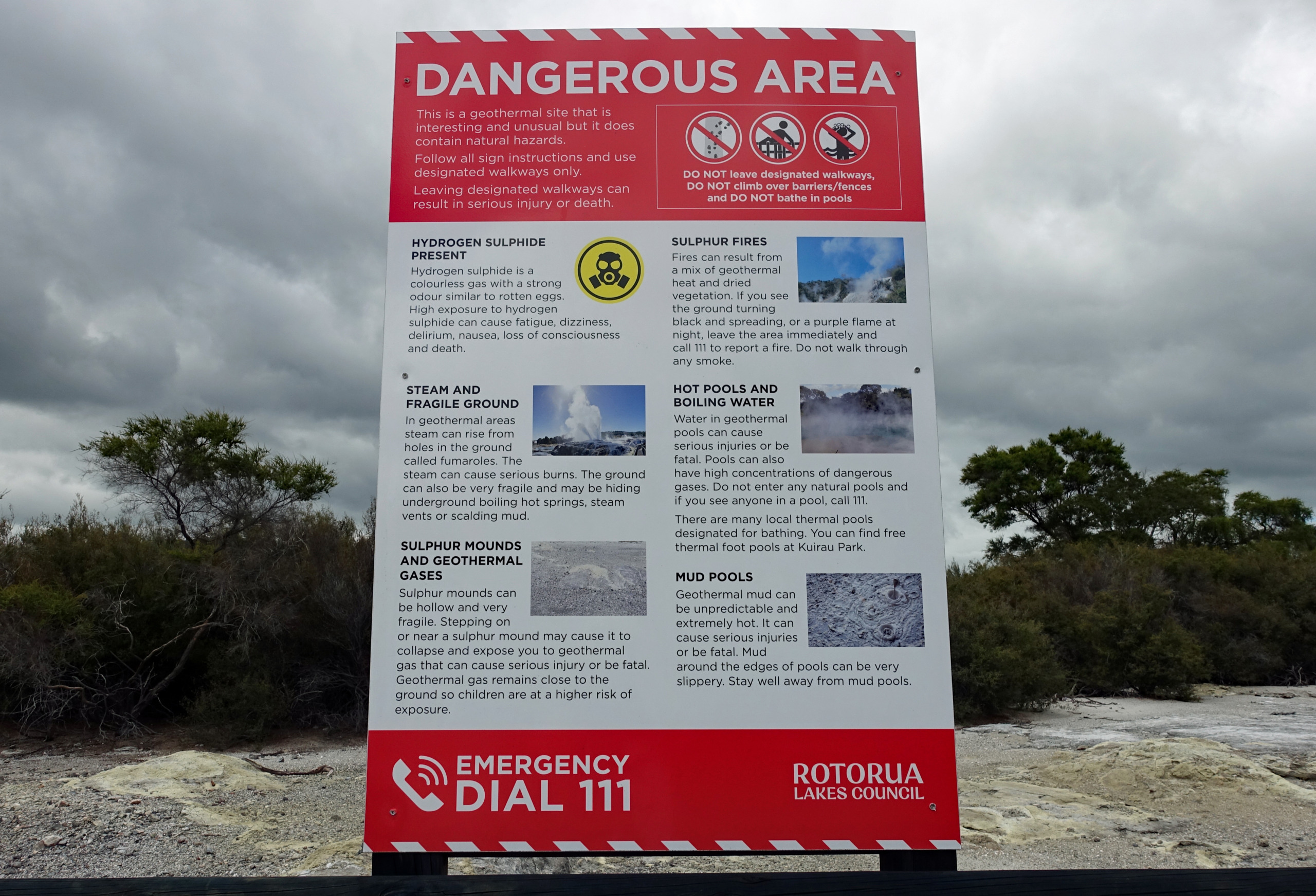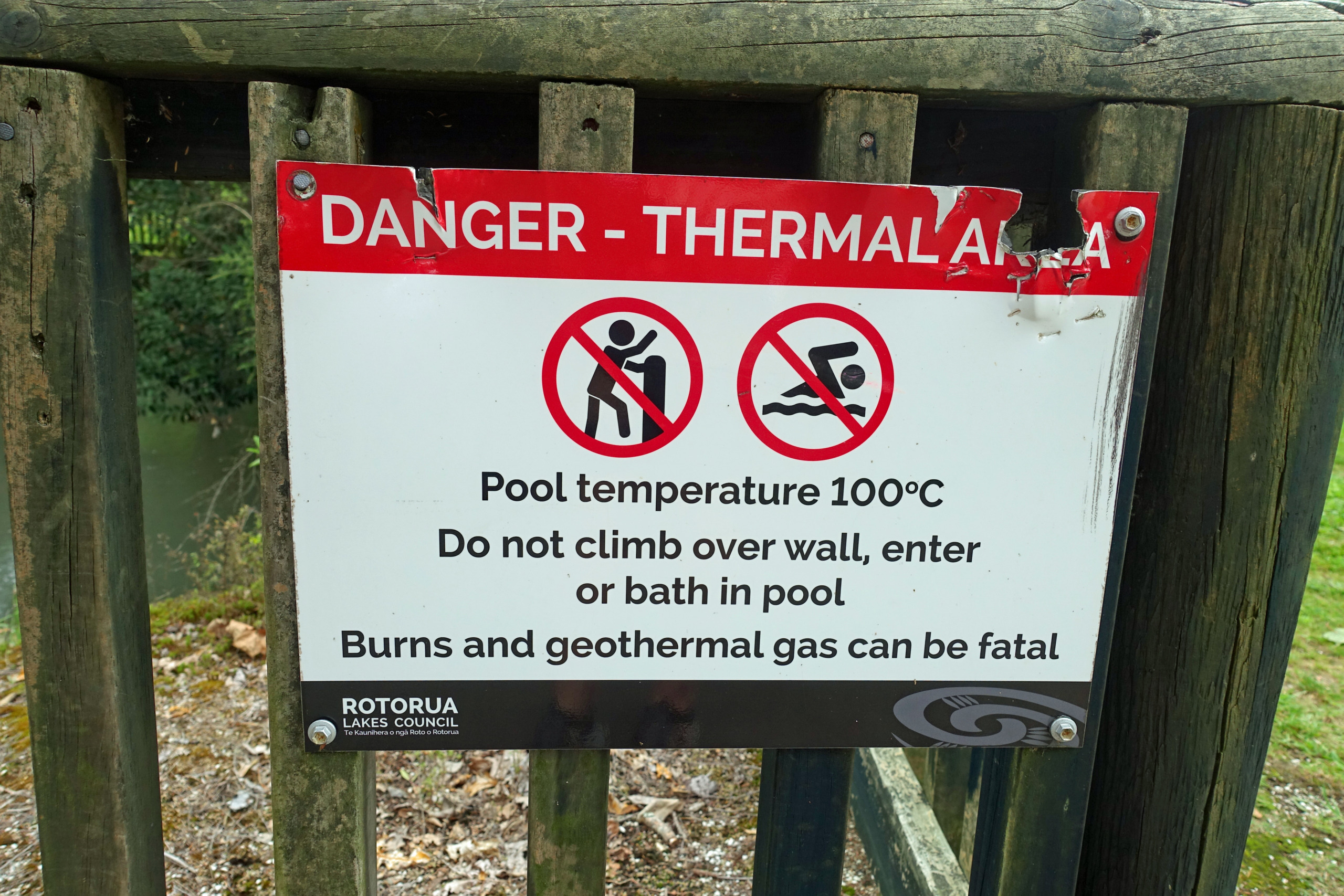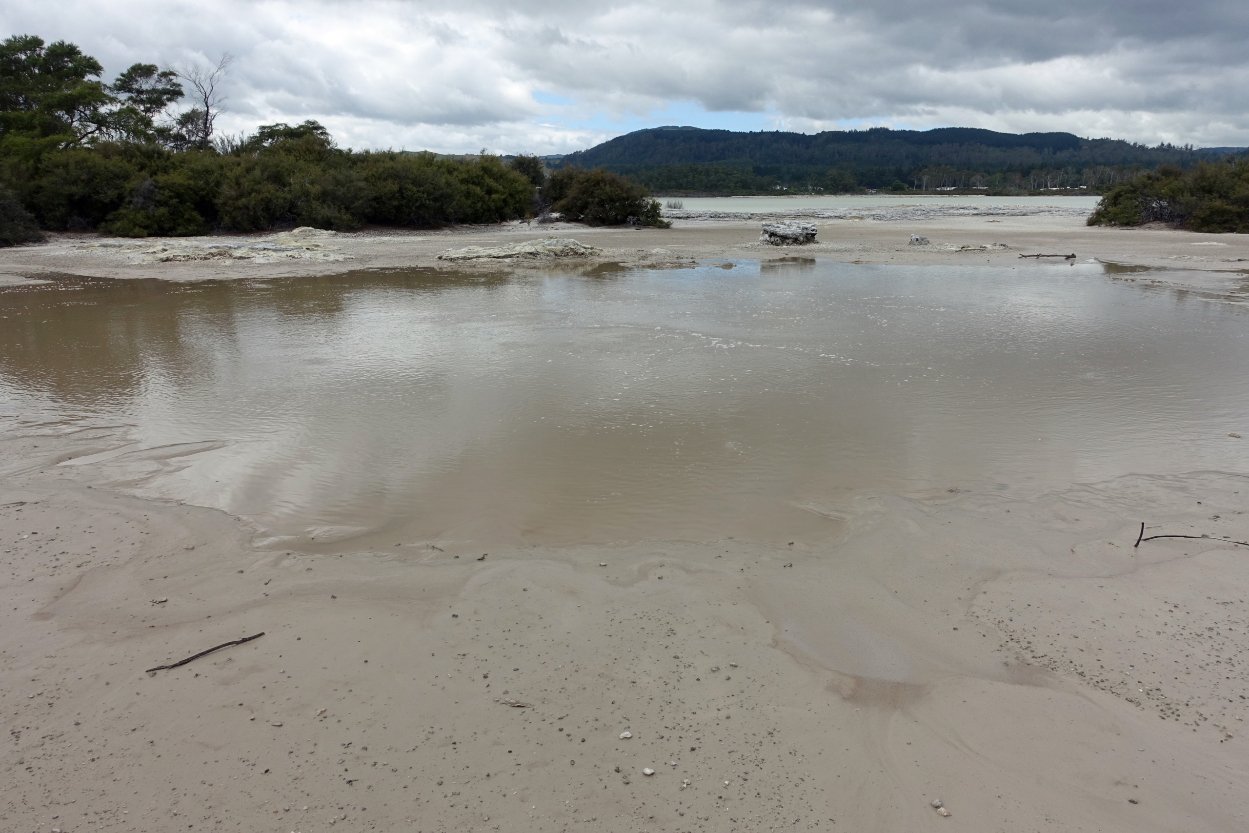Right behind the Rotorua Museum, which is closed until 2028 for repairs and renovations, is the Sulphur Point walkway. This is a free walk along the lake where the hydrogen-sulphide smell (rotten eggs) is very evident. The walkway offers several great spots to safely view active geothermal features up close, with steam rising from the ground and gurgling waters. Blair and I both commented that we were able to walk closer to the lake last time we were here but it did feel a bit dangerous even then, so we were not surprised that fencing has been put up to keep folks back. Back then there were signs warning that the ground could collapse under you and not get too close to the open holes…I assume it became too risky.