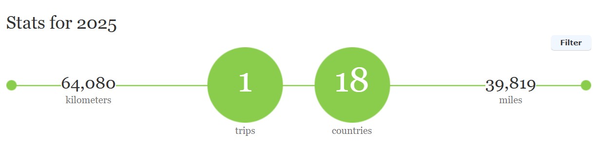 Beyond the logistics and milestones, how are we actually doing? Eight years into our planned ten-year nomadic journey, we remain genuinely happy we chose this path. We occasionally miss the comfort of a permanent home, yet those feelings are often overshadowed by the magic of discovering new places, making us want to travel forever. The constant effort of planning can feel tedious and staying fit on the road remains a challenge, so we sometimes see the appeal of a slower pace. For a variety of reasons it may not be such a bad thing to have a home base at some point, the problem is deciding where 😊 Our health was good this past year with no major events, just the normal ageing process as we creep towards the end of our 60’s.