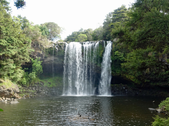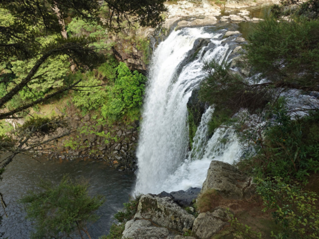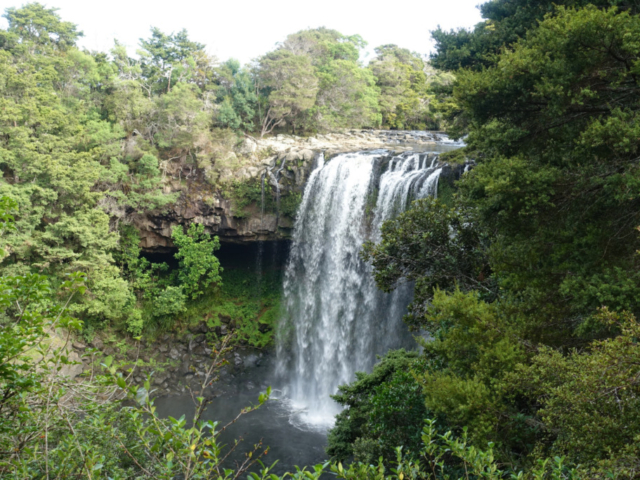 Waianiwaniwa (Rainbow Falls) is a 27-meter single-drop waterfall located on the Kerikeri River close to Waipapa. Unlike most New Zealand waterfalls formed by soft rock erosion, these falls plunge over a hard basalt ledge on to the softer mudstone beneath. There are three distinct viewpoints of the falls. Two provide top-down perspectives of the 27-meter drop, while the third is located near the base of the falls.